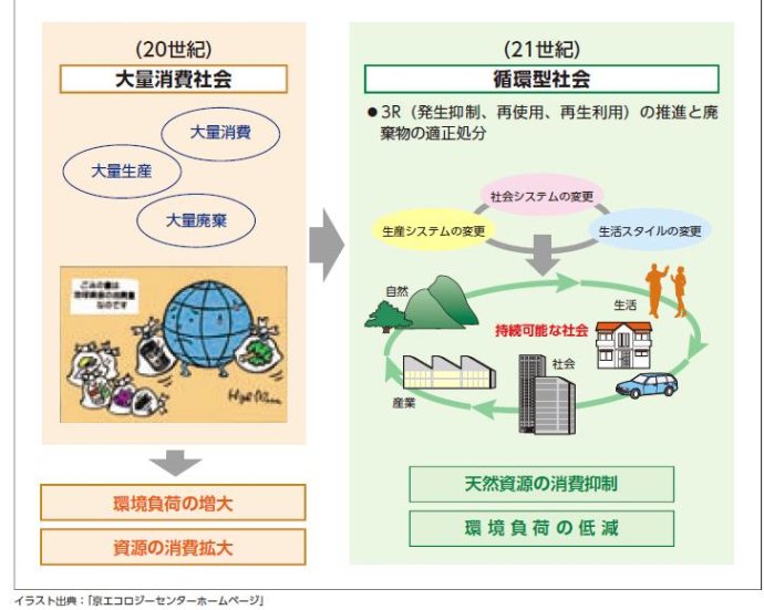 4)日本生活垃圾產(chǎn)生量的下降不是因?yàn)槔诸悾歉淖兿M(fèi)模式。1997年到2007年是日本生活垃圾分類收集全面實(shí)施的10年,生活垃圾回收利用率從1997年11%提高到2007年20.3%,但生活垃圾的產(chǎn)生量并沒有明顯下降,1997年到2000年期間還有所增長,2000年達(dá)到最高值,2000年后開始有所下降,由人均生活垃圾日產(chǎn)生量1.132千克下降到0.90千克(2014年),巧合的是日本建設(shè)循環(huán)型社會(huì)的基本法正是從2000年開始實(shí)施的,有關(guān)建設(shè)循環(huán)型社會(huì)的要求明確要改變消費(fèi)模式,即改變大量生產(chǎn)、大量消費(fèi)、大量廢棄的模式(見下圖),明確提出抑制消費(fèi),減輕環(huán)境負(fù)荷;換句話說,減少消費(fèi)才是減少社會(huì)垃圾產(chǎn)生的有效途徑。當(dāng)前,我國要真正實(shí)現(xiàn)生活垃圾減量,宏觀上就需要抑制消費(fèi),我們從思想上、心底里、現(xiàn)實(shí)條件中準(zhǔn)備好了嗎!想起一次會(huì)議上,來自歐洲的專家講,現(xiàn)代的綠色城市標(biāo)志是居民出行騎自行車;我與他們說,按照這樣的條件,在我國上世紀(jì)七十年代、八十年代許多城市都滿足這樣的條件,但顯然這不是大家所希望的。如今在歐洲等發(fā)達(dá)國家倡導(dǎo)綠色、低碳理念,提倡自行車出行符合這樣的理念當(dāng)然是正確的,但他們是在家家有車甚至人人有車的基礎(chǔ)上鼓勵(lì)少開車、多用自行車出行;如今我國正在邁入小汽車時(shí)代,交通擁堵已經(jīng)成為“城市病”特征,盡管如此,如果我們對(duì)一個(gè)還沒有開個(gè)車正在夢(mèng)想擁有自己小汽車的人,去宣導(dǎo)少開車、不開車,為了綠色與低碳,他不認(rèn)為這樣的宣導(dǎo)是“有病”,也會(huì)認(rèn)為是可笑的。經(jīng)歷改變行為,釋迦摩尼曾經(jīng)是印度王子,在金錢、美女都有充分體會(huì)才去普度眾生。我們大多數(shù)人還奔跑在全面小康的路上,雖然部分人確實(shí)先富起來,但他們通過各類影視告訴大眾,什么是有錢人,有錢人吃剩了就扔,不會(huì)放在冰箱里;就是一些聲稱注重環(huán)保的名人代言環(huán)保廣告也公開呼吁喝小瓶裝的瓶裝水(為了減少浪費(fèi)為未喝完的水,忘記了忽略了把未喝完的水帶著繼續(xù)喝),這與發(fā)達(dá)國家為減少包裝垃圾提倡喝大瓶裝的瓶裝水截然相反。千方百計(jì)擴(kuò)大消費(fèi)、想盡辦法誘導(dǎo)消費(fèi)仍然是主旋律,耳邊又響起央視“小罐茶”的廣告……