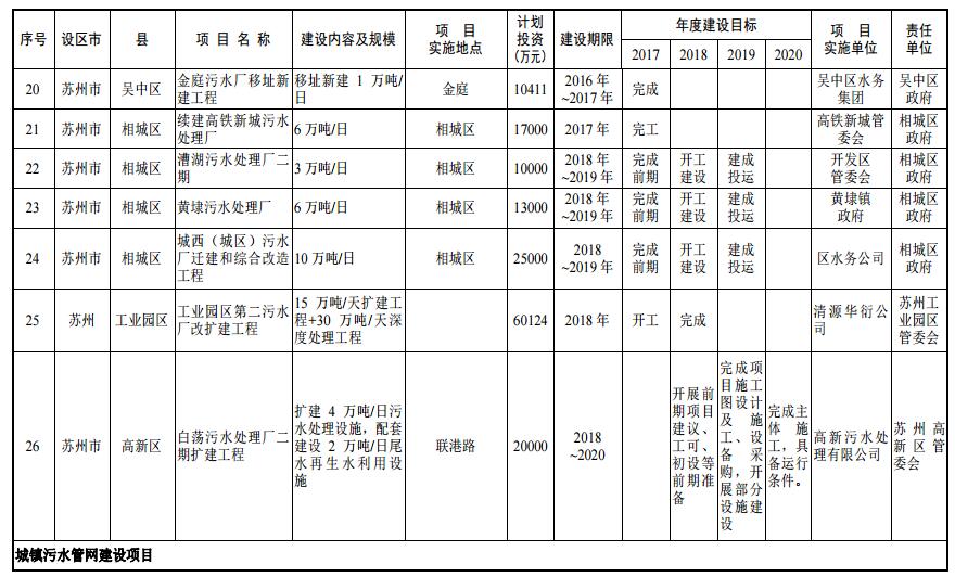 到 2020 年,蘇州市區(qū)、縣級(jí)市建成區(qū)生活污水基本實(shí)現(xiàn)全收集、全處理;全面推進(jìn)城鎮(zhèn)污水處理設(shè)施建設(shè),到 2019 年,蘇州市區(qū)、縣級(jí)市污水處理率分別達(dá)到 95%、85%。到 2020 年,蘇州市區(qū)、縣級(jí)市污水處理率分別達(dá)到 98%、90%;加強(qiáng)污泥處理處置,2017 年底前,完成現(xiàn)有城鎮(zhèn)污水處理廠污泥處理處置設(shè)施達(dá)標(biāo)改造,設(shè)區(qū)、縣級(jí)市建成城鎮(zhèn)污水處理廠污泥綜合利用或永久性處理處置。2020 年底前,縣級(jí)市實(shí)現(xiàn)永久性污泥處理處置設(shè)施全覆蓋。