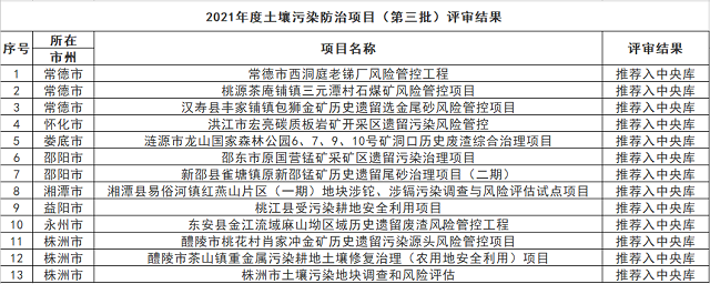 湖南省生態(tài)環(huán)境廳關于2021年度土壤污染防治項目(第三批)、地下水污染防治項目(第二批)評審結果的公示 根據(jù)《土壤污染防治專項資金管理辦法》、《關于印發(fā)<中央生態(tài)環(huán)境資金項目儲備庫入庫指南>的通知》、《湖南省省級財政專項資金公開辦法(試行)》等有關要求,經(jīng)項目單位申請、市級環(huán)保部門審查、...
