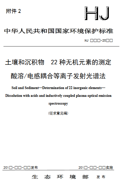 為貫徹《中華人民共和國環(huán)境保護法》,保護與控制質量,保障人體健康,規(guī)范土壤沉積物中無機元素的測定方法,印發(fā)《土壤和沉積物 22種無機元素的測定 酸溶/電感耦合等離子發(fā)射光譜法(征求意見稿)》,詳情如下: