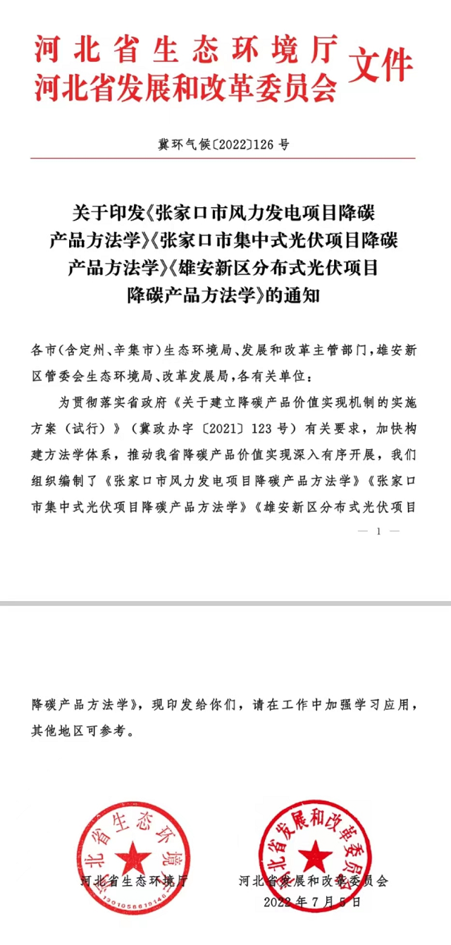 近日,由張家口市生態(tài)環(huán)境局組織編制的《張家口市風(fēng)力發(fā)電項目降碳產(chǎn)品方法學(xué)》和《張家口市集中式光伏項目降碳產(chǎn)品方法學(xué)》,獲河北省生態(tài)環(huán)境廳、河北省發(fā)展改革委聯(lián)合批準(zhǔn)發(fā)布實施,是2022年河北省首批發(fā)布的降碳產(chǎn)品方法學(xué),也是全國首個市級“綠電”降碳產(chǎn)品方法學(xué)。 今年以來,張家口市...