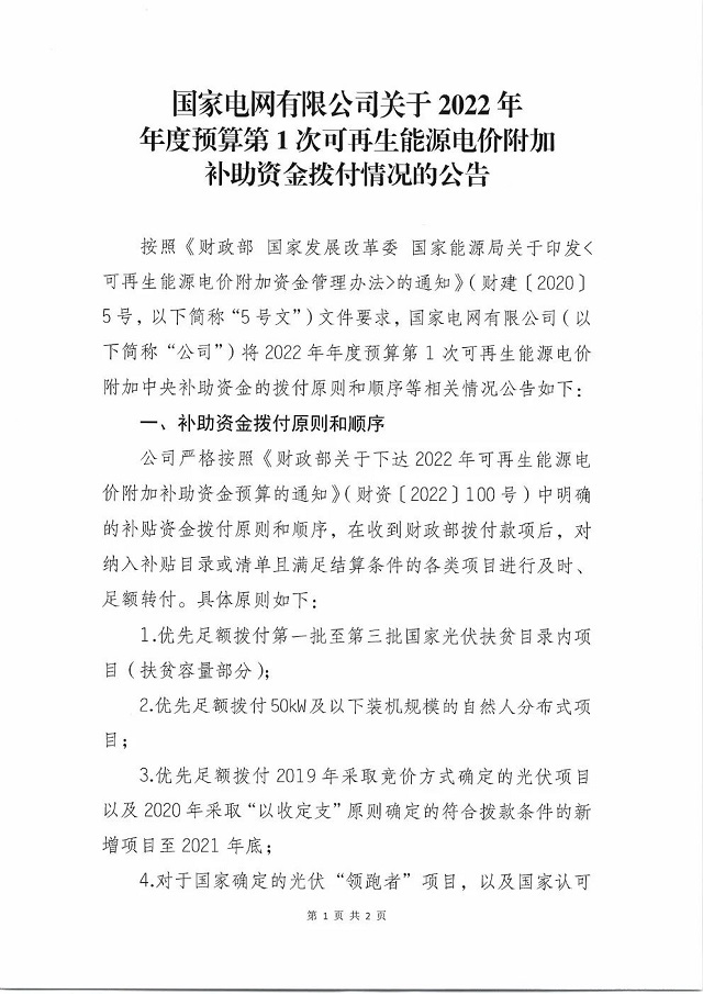 2022年7月15日,國家電網(wǎng)微信平臺發(fā)布“關(guān)于2022年年度預(yù)算第1次可再生能源電價附加補助資金撥付情況的公告”,提到將對納入補貼或清單且滿足結(jié)算條件的各類項目進行及時、足額轉(zhuǎn)付。 具體來看,2022年年度預(yù)算第1次請款,財政部共預(yù)計撥付國家電網(wǎng)可再生能源電價附加補助資金年...
