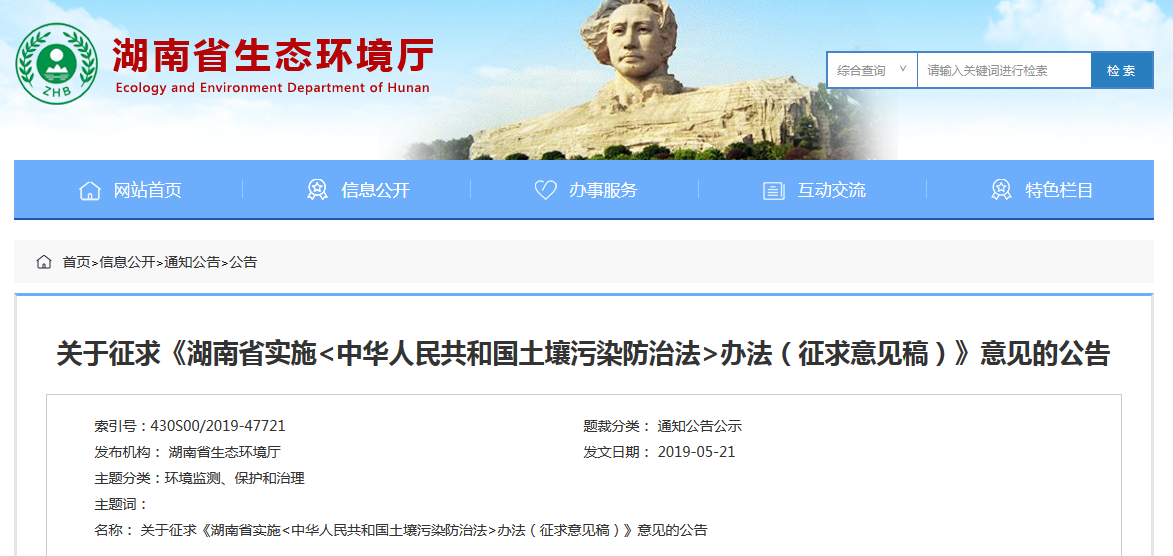 近日,湖南省生態(tài)環(huán)境廳發(fā)布《湖南省實施<中華人民共和國土壤污染防治法>辦法(征求意見稿)》,詳情如下:根據(jù)省人大立法計劃,我廳組織起草了《湖南省實施<中華人民共和國土壤污染防治法>辦法(征求意見稿)》(見附件)。為提高立法質(zhì)量,現(xiàn)公開征求意見,請將修改意見通過傳真或電子郵件等...