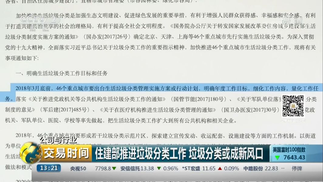 隨著2017年成為環(huán)保政策爆發(fā)年之后,環(huán)保板塊活躍度一度攀升,其中2017年7月18日至10月13日,指數(shù)上漲17.09%,跑贏同期上證綜指10.35個百分點。2017年底,住建部發(fā)文要求加快推進46個重點城市的工作。那么垃圾的分類回收、處理會給企業(yè)帶來哪些新的商機呢?住建部推進垃圾分類工作 垃圾分...