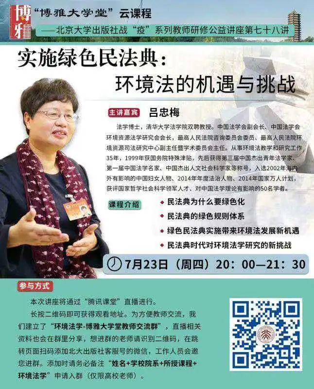 文章導(dǎo)讀 本文為?呂忠梅?老師在博雅大學(xué)堂上的報告。題目為《綠色民法典實(shí)施:環(huán)境法的機(jī)遇與挑戰(zhàn)》。內(nèi)容主要涉及民法典為什么要綠色化、民法典的綠色規(guī)則體系及綠色民法典給環(huán)境法帶來的新機(jī)遇和新挑戰(zhàn)。"博雅大學(xué)堂"PPT聲明本公眾號刊載的部分文字、圖片、音頻、視頻以及網(wǎng)頁版式設(shè)計(jì)等來源于網(wǎng)絡(luò)。原作者如不愿...