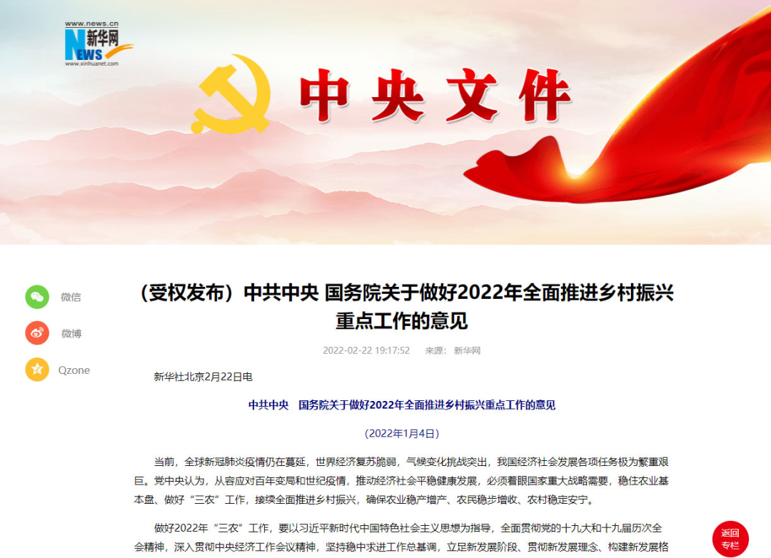 2月22日,新華網(wǎng)授權(quán)發(fā)布《中共中央 國(guó)務(wù)院關(guān)于做好2022年全面推進(jìn)鄉(xiāng)村振興重點(diǎn)工作的意見(jiàn)》(又稱“2022年中央一號(hào)文件”),對(duì)2022年的“三農(nóng)”工作做出了全面部署。 一年一度的“中央一號(hào)文件”又公布了。 2月22日,新華網(wǎng)授權(quán)發(fā)布《中共中央 國(guó)務(wù)院關(guān)于做好2022年全面推進(jìn)鄉(xiāng)村振興重點(diǎn)工作的...