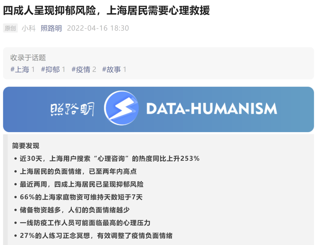 據(jù)心理領(lǐng)域的公眾號(hào)“照路明”,說(shuō)現(xiàn)在上海疫情嚴(yán)重,大家隔離短的已經(jīng)半個(gè)多月,長(zhǎng)的一個(gè)多月,近四成上海人呈現(xiàn)抑郁風(fēng)險(xiǎn),需要救援。 圖片來(lái)自網(wǎng)絡(luò) 其實(shí),這些心理救援是非常重要的。每個(gè)人碰到這種百年不遇的疫情和居家隔離,都會(huì)出現(xiàn)或多或少的心理問(wèn)題。如果能打通心理咨詢熱線最好,可以聽(tīng)聽(tīng)專業(yè)人士的輔導(dǎo)。如果搶...