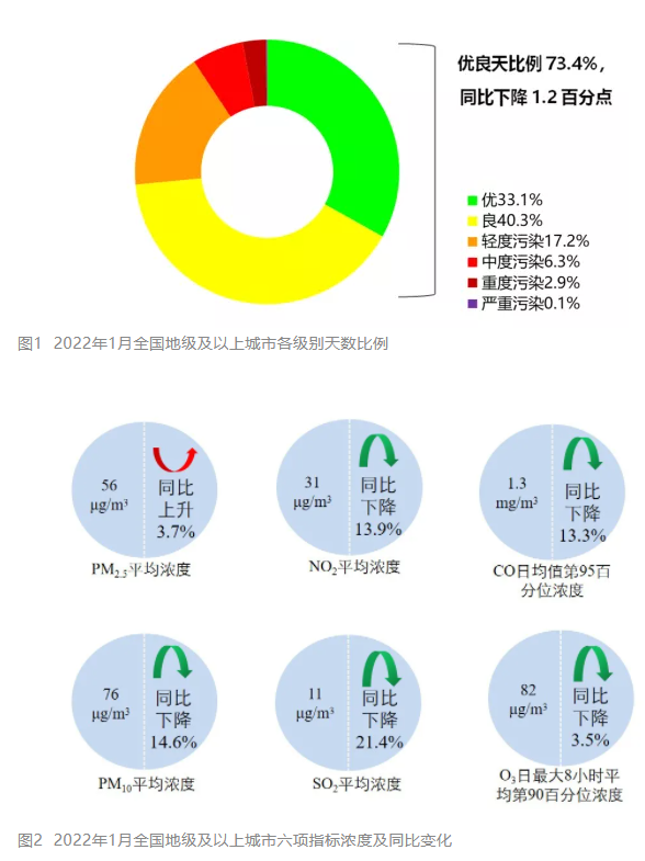 生態(tài)環(huán)境部今日向媒體通報(bào)了2022年1月全國(guó)環(huán)境空氣質(zhì)量狀況。 總體情況 1月,全國(guó)339個(gè)地級(jí)及以上城市平均空氣質(zhì)量?jī)?yōu)良天數(shù)比例為73.4%,同比下降1.2個(gè)百分點(diǎn);PM2.5平均濃度為56微克/立方米,同比上升3.7%;PM10平均濃度為76微克/立方米,同比下降14.6%;O3平均濃度為82微...