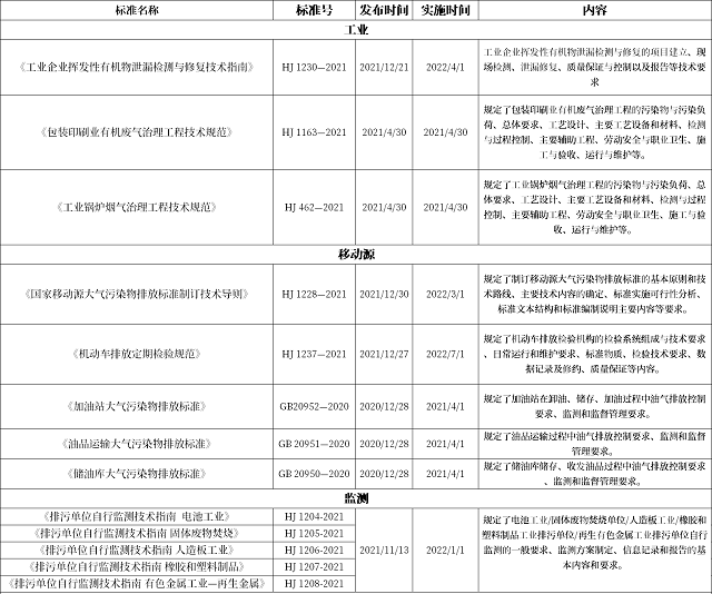 2022年4月1日,國(guó)家生態(tài)環(huán)境標(biāo)準(zhǔn)《工業(yè)企業(yè)揮發(fā)性有機(jī)物泄漏檢測(cè)與修復(fù)技術(shù)指南》將正式施行。 其實(shí),自生態(tài)環(huán)境保護(hù)工作步入第十四個(gè)五年規(guī)劃以來(lái),作為深入打好污染防治攻堅(jiān)戰(zhàn)的重要環(huán)節(jié),大氣污染防治相關(guān)標(biāo)準(zhǔn)就一直在陸續(xù)更新中,涉及工業(yè)、移動(dòng)源、監(jiān)測(cè)等多個(gè)領(lǐng)域,粗略整理如下: 《工業(yè)企業(yè)揮發(fā)性有機(jī)物泄漏...