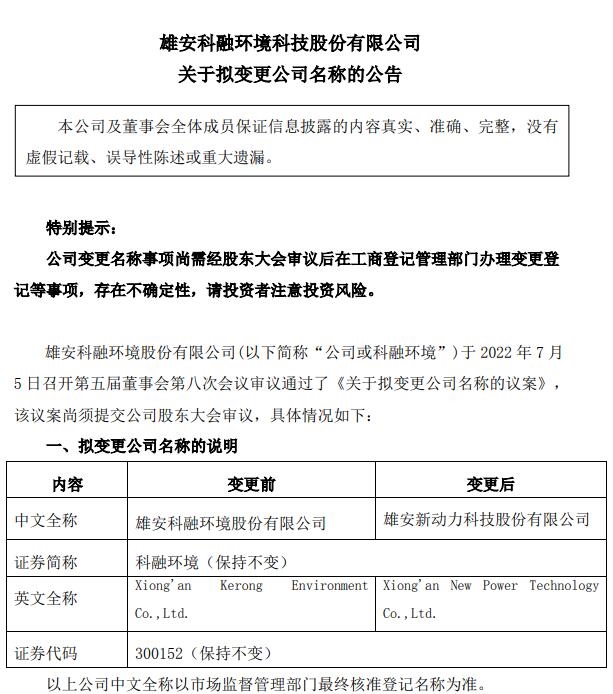 2022年7月5日,雄安科融環(huán)境科技股份有限公司發(fā)布《關(guān)于擬變更公司名稱的公告》。 科融環(huán)境擬更名為“雄安新動(dòng)力科技股份有限公司”,證券簡(jiǎn)稱不變,證券代碼不變。(公司中文全稱以市場(chǎng)監(jiān)督管理部門(mén)最終核準(zhǔn)登記名稱為準(zhǔn)) 科融環(huán)境表示,更名原因在于公司自2010年IPO以來(lái),業(yè)務(wù)從...