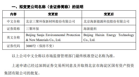 2022年6月29日,北京三聚環(huán)保新材料股份有限公司發(fā)布了《關(guān)于擬變更公司名稱(含證券簡稱)的公告》。 即,“北京三聚環(huán)保新材料股份有限公司”變更為“北京海新能源科技股份有限公司”,證券簡稱從“三聚環(huán)保”變更為“海新...