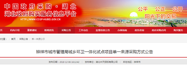 2018年12月6日,湖北省鐘祥市城鄉(xiāng)環(huán)衛(wèi)一體化試點項目發(fā)布單一來源采購方式公告,擬選擇單一來源供應商為中國光大生態(tài)資源(香港)有限公司,項目預算2262萬/年。 據悉,項目的服務范圍以鐘祥市所轄的5個鄉(xiāng)鎮(zhèn)為試點(包括:舊口鎮(zhèn)、柴湖鎮(zhèn)、長灘鎮(zhèn)、九里鄉(xiāng)、東橋鎮(zhèn))共計147個行政村,主要內容包括農村鎮(zhèn)區(qū)...
