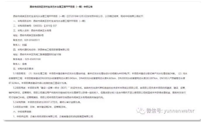 2018年12月10日,陜西省政府采購網對“西安市閻良區(qū)農村生活污水治理工程PPP項目(一期)”中標作公告,云南水務聯同云南省建設投資控股集團有限公司成功中標。 該項目以PPP模式運作,將建設污水處理工程和污水收集管網工程,總投資約4億元。項目合作期限為30年,其中建設期2年...