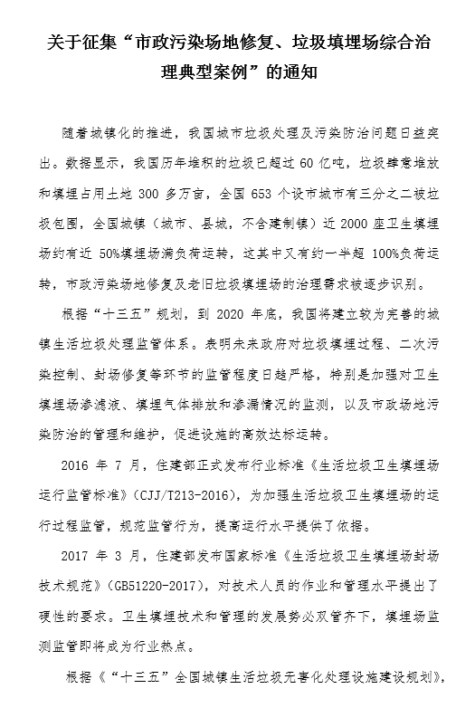 關于征集“垃圾分類優(yōu)秀模式案例”的通知2016年12月,國家主席習近平在中央財經領導小組第十四次會議中強調,要加快建立分類投放、分類收集、分類運輸、分類處理的垃圾處理系統(tǒng);形成以法治為基礎、政府推動、全民參與、城鄉(xiāng)統(tǒng)籌、因地制宜的垃圾分類制度;普遍推行垃圾分類制度,努力提高垃圾分類制度覆蓋范圍。20...
